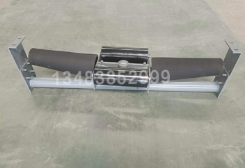 雙中輥調(diào)偏托輥組回轉(zhuǎn)軸焊在下橫梁上,回轉(zhuǎn)總成(包括組合軸承、回轉(zhuǎn)軸套)安裝在下橫梁上方,回轉(zhuǎn)總成外圍設(shè)計(jì)了可擺動(dòng)的中托輥橫梁,以回轉(zhuǎn)軸為中心,在運(yùn)行膠帶前、后中托輥橫梁上各設(shè)置一個(gè)中托輥,形成以回轉(zhuǎn)軸為中心的平衡支撐。側(cè)托輥采用加大軸承和軸徑設(shè)計(jì),用側(cè)托輥軸代替常規(guī)的側(cè)托輥橫梁功能。側(cè)托輥可拆卸的安裝在兩中輥中間。側(cè)托輥為錐形輥設(shè)計(jì),錐形輥采用鑄橡膠結(jié)構(gòu),其在膠帶跑偏時(shí)能產(chǎn)生較大的回向阻尼效果,從而使膠帶居中平穩(wěn)運(yùn)行。